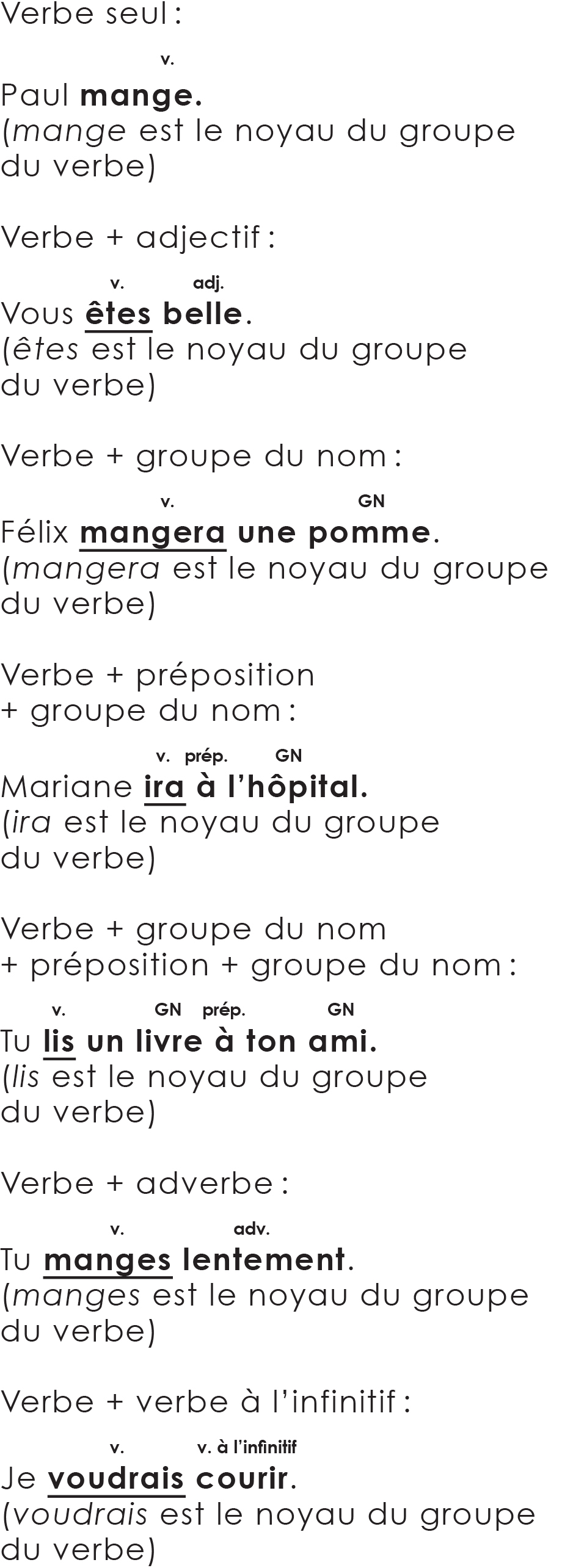Le groupe du verbe est l’un des deux constituants obligatoires de la phrase, avec le groupe sujet. Il indique ce que l’on dit à propos du groupe sujet. Le groupe du verbe contient toujours un verbe conjugué. Ce verbe conjugué est le noyau du groupe du verbe. Le verbe conjugué peut être seul ou accompagné d’un complément du verbe ou d’un attribut du sujet. Le groupe du verbe est généralement placé après le groupe sujet.