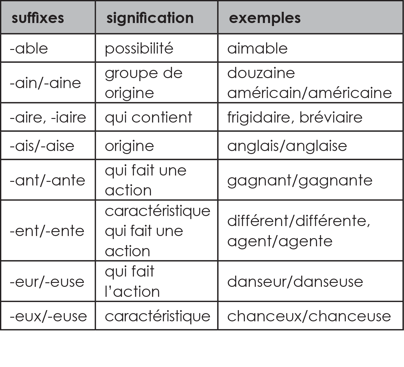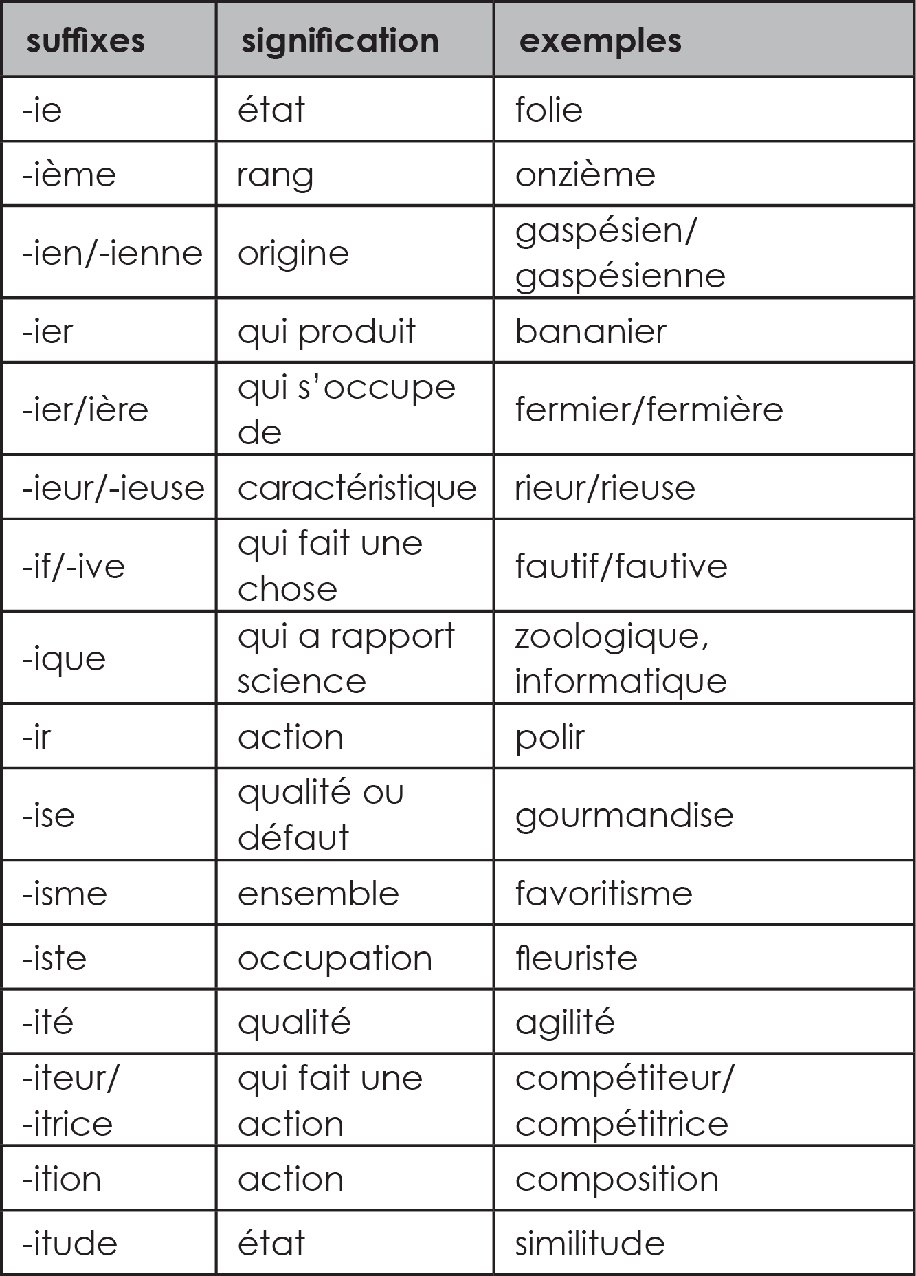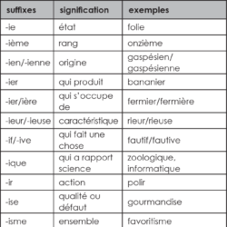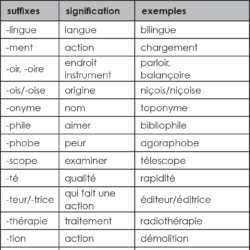 Les suffixes Définition : Un suffixe est un élément placé à la fin d’un mot pour en former un nouveau. Exemples : chauffage glissade fabrication Les suffixes qui servent à former des noms Les suffixes qui servent à former des verbes Les suffixes qui servent à former des adjectifs Le suffixe qui sert à former des adverbes Edit