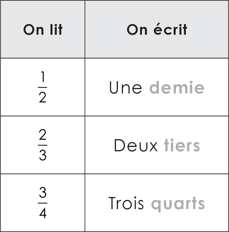 Toutes les fractions se lisent du haut vers le bas. En général, on ajoute le suffixe « ‑ième(s) » au chiffre du bas.