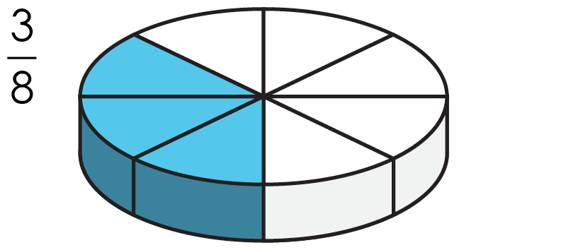 Trois parties sur huit, ou trois huitièmes, cela signifie que sur les huit parties de l’entier, j’en choisis trois.