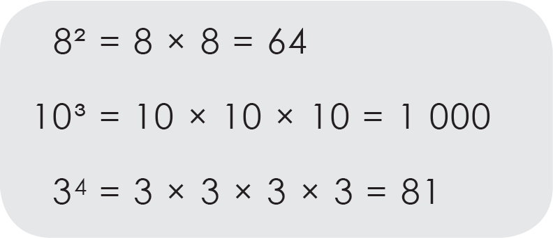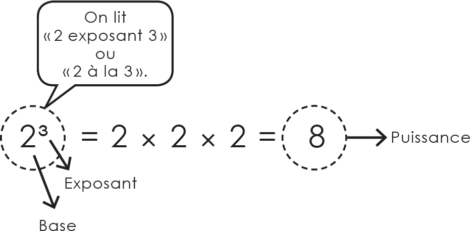La notation exponentielle est une façon plus rapide d’écrire une multiplication répétée du même nombre. L’exposant indique le nombre de fois qu’une quantité est répétée. Le résultat de cette multiplication répétée se nomme la puissance.