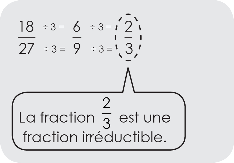 Une fraction irréductible est une fraction qu’on ne peut plus simplifier, c’est-à-dire qu’on ne peut plus diviser le numérateur et le dénominateur par un diviseur commun autre que 1.